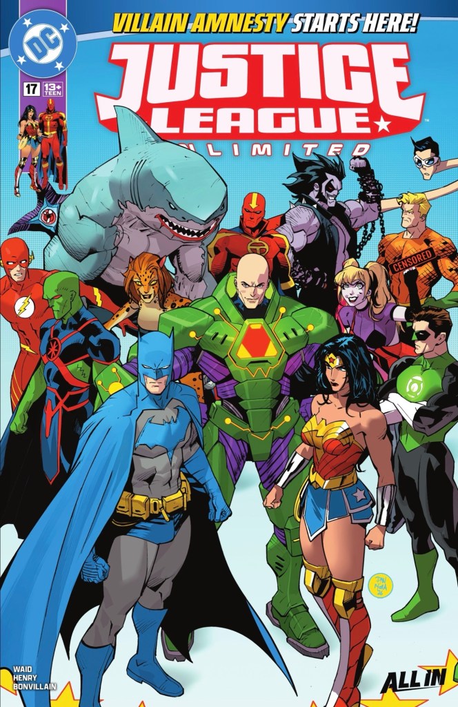 Dan Mora produces an especially fabulous cover this issue, it’s just a shame the very traditional JLA stars circling the characters have been cut off. As for the particular group, it’s a mix of heroes and villains, but for once they’re not fighting, they’re mingling. And the title, Villain Amnesty, implies bad guys are joining the League – I doubt that will end well, and it looks like several Leaguers share my pessimism.