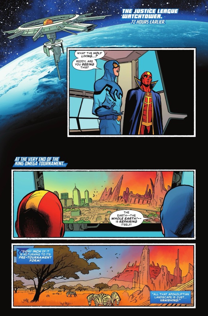 After a cold open showing Giganta, Lex Luthor and a mini-Starro – Jarro from the Geoff Johns days? – out on League business, we flash back three days. A gaggle of good guys are holding the fort at the Watchtower while bigger names are fighting in the DC KO tournament; unknown to them, it’s over.