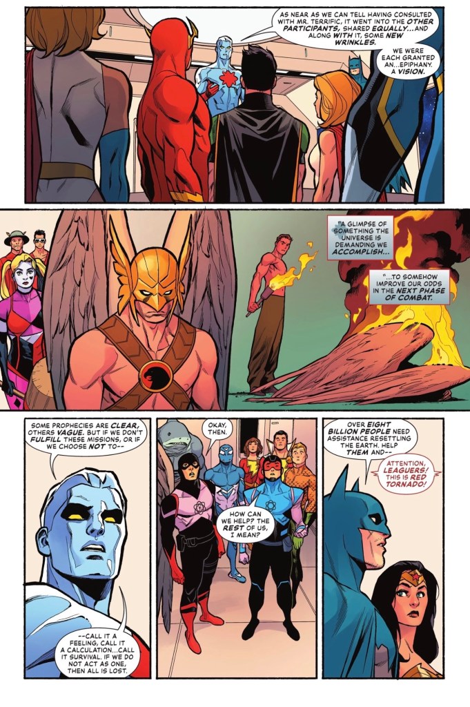 Seconds later, the other heroes return – all except Superman,who’s off on a personal secret mission as he plans to divest himself of the god-level energy he’s recently absorbed. While he’s away, says Wonder Woman, the rest of them have their own tasks…