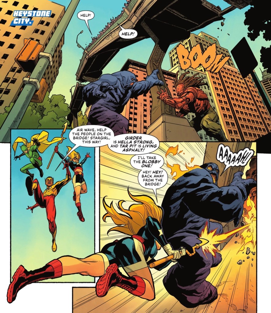 Before everyone can digest this rather wild nugget of information, news arrives that there’s trouble in Keystone City – Flash rogues Tarpit and Girder at a crumbling bridge.