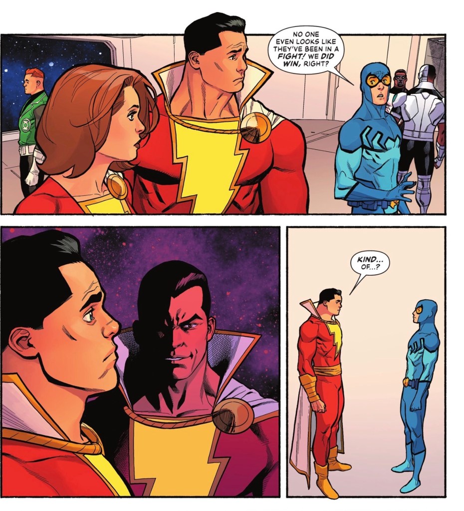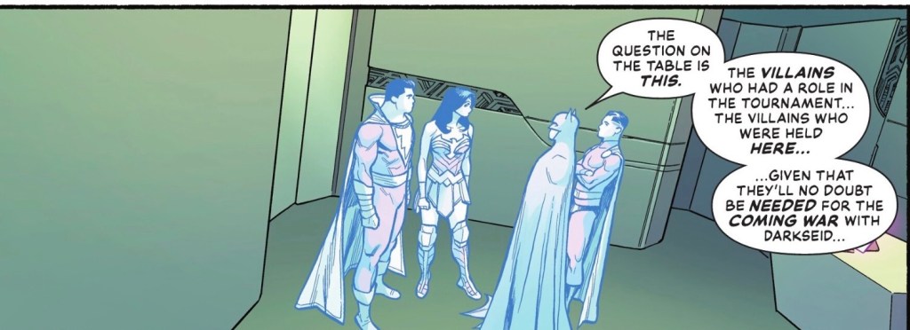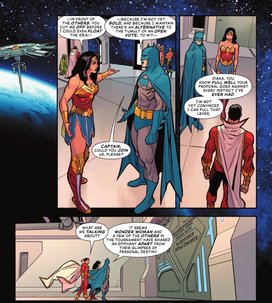 What does Captain Marvel have in common with Diana? God-given wisdom, which Batman wants him to apply to Wonder Woman’s idea. They also bring Mon-El, future Legionnaire and current warden of the Phantom Zone, into the discussion.