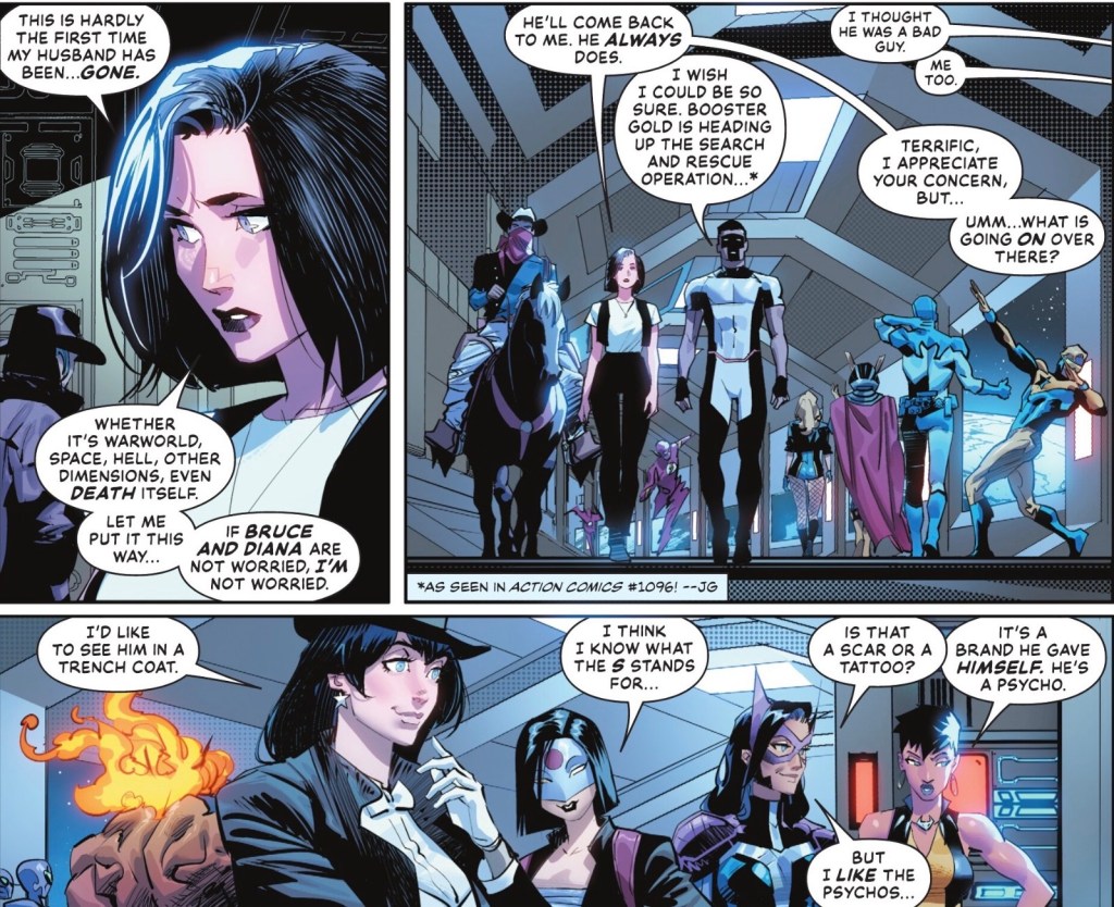 And he has Lois rooting for him. She’s on the Justice League Watchtower, where an examination by Mr Terrific has confirmed her recent super powers are gone. Outside the exam room she comes across a few rather distracted Lady Leaguers.