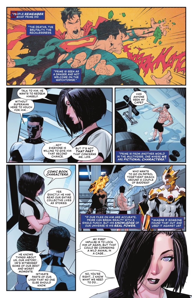 This issue also features a fight. A big one, with a major player from the early 2000s. And does Prime apply his new ‘what would Superman do?’ creed to the slugfest? I’m not telling, buy this book, it’s hugely refreshing after the massive scope of DC KO, a more intimate Super-story. It’s one guy with a cape trying to be the best he can be. Superboy Prime started out as a good guy, simply the Superboy of another Earth. Sent mad and murderous by his involvement in a Crisis or two, he saw the error of his ways during the Dark Crisis, the people he killed seem to be back, and he’s been learning at the side of Superman and Lois what it really means to wear the ‘S’. Given the goodwill and help of Mrs Superman, will he prove worthy?