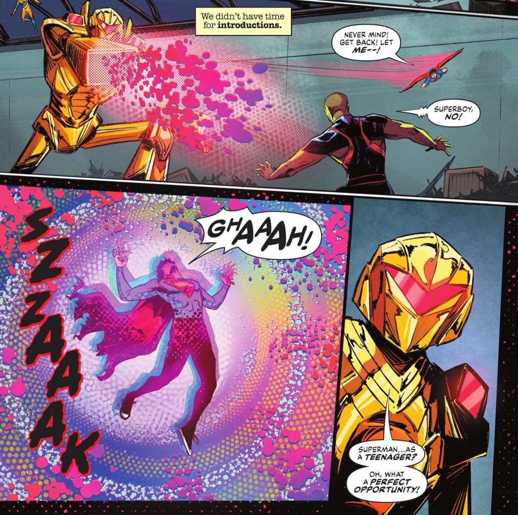 Whatever opportunity he sees, Epoch doesn’t take it, teleporting away. This gives the heroes a chance to introduce themselves to Superboy.
