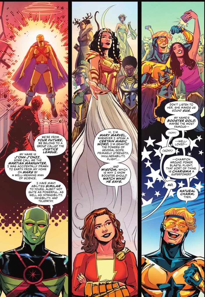 Mark Waid gives the impression that he’s been thinking constantly about DC characters since he was five years old, making folk who have been around decades seem as fresh as spring lamb. One thing I really enjoyed was the contrasting sides of J’onn, on the one hand telling Booster to watch the spoilers even after he’s the guy who namedropped ‘Krypton’ and on the other admitting to Superboy that the powers he has in common with the Boy of Steel aren’t quite as strong.