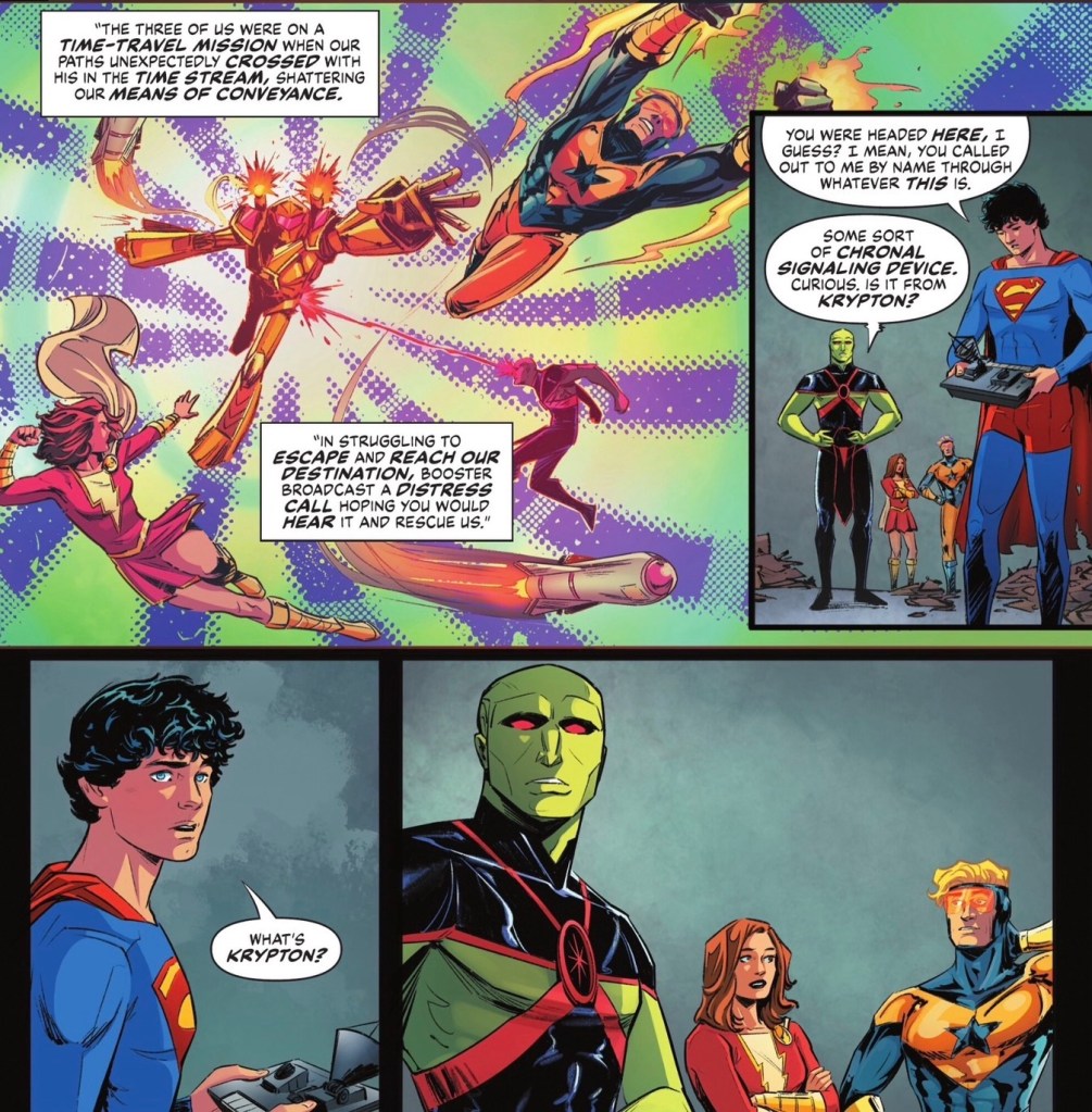 Introduction over, they tell Superboy that the Lord of Time is a would-be universal conqueror from the far future. And then J’onn has a question for the Boy of Steel.