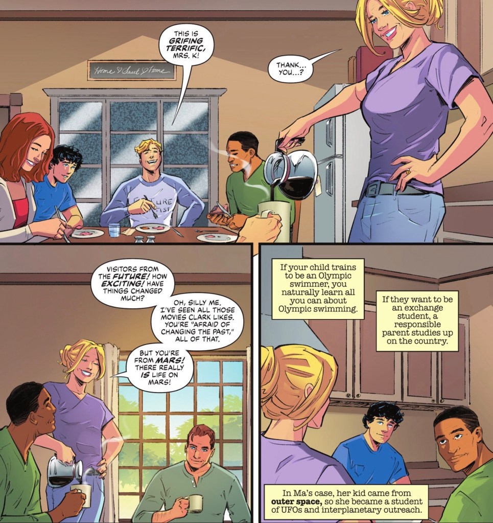 J’onn promises to explain later, the immediate problem is whether the Lord of Time will target Superboy if he, Booster and Mary return to the timestream. They agree to stay around awhile, meaning they become the latest recipients of the famous Jon and Martha hospitality, with J’onn in one of his human modes.