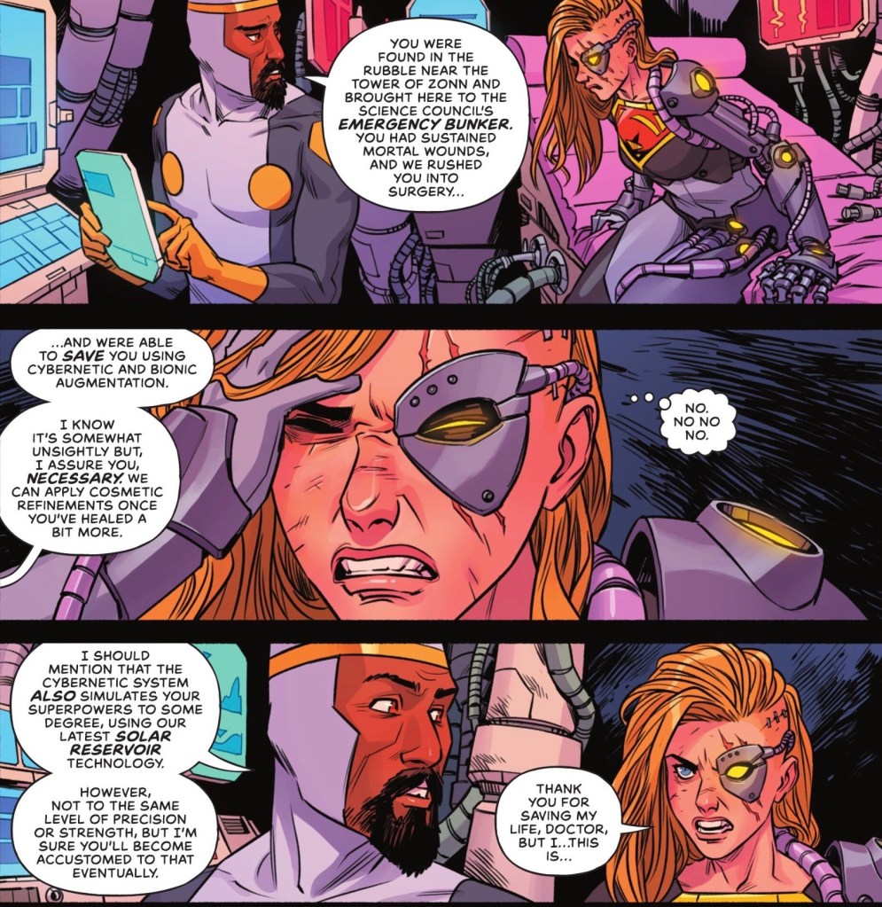 Now, generally I get a kick out of seeing new looks for Supergirl. Not this time… poor Kara has been remade into a robotic heroine after last month’s brutal battle with Black Flame in the Bottle City of Kandor.
