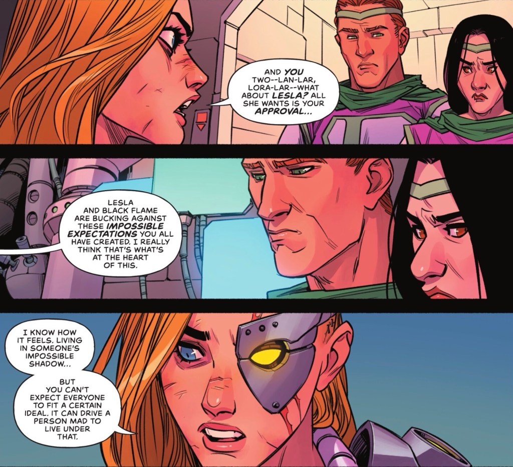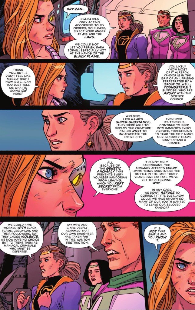 Kara and Kim-Da are soon interrupted by Kandor’s council chief and the parents of her (very confused) friend Lesla-Lar. They tell her more about the recent rebellion by the young people of the city.