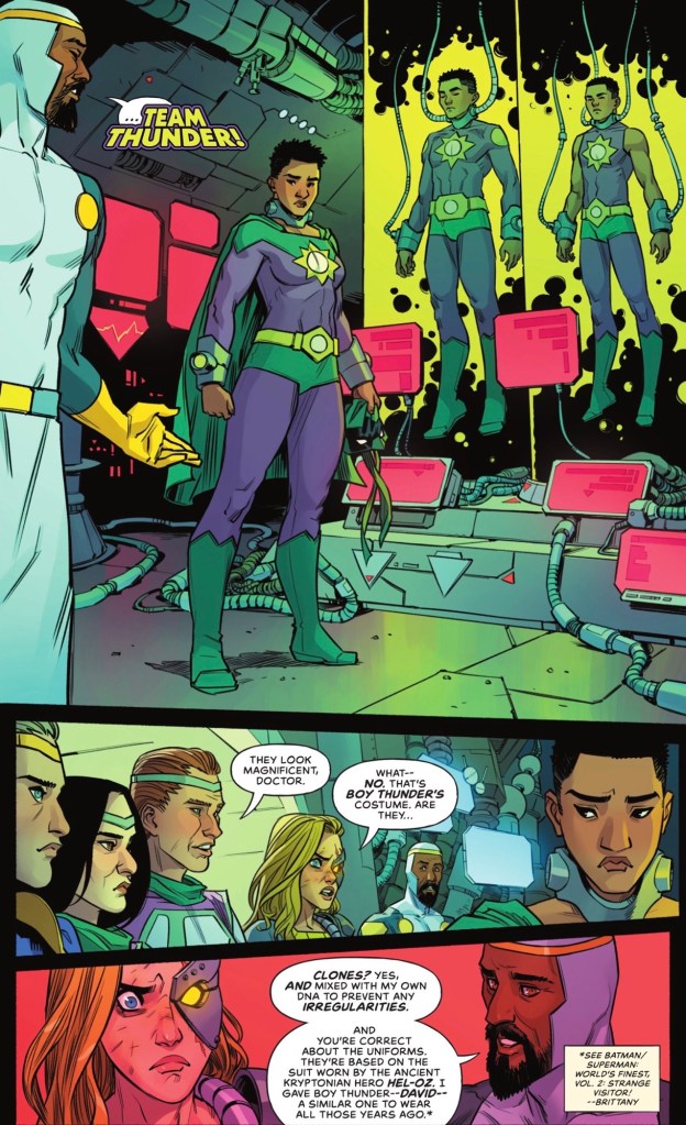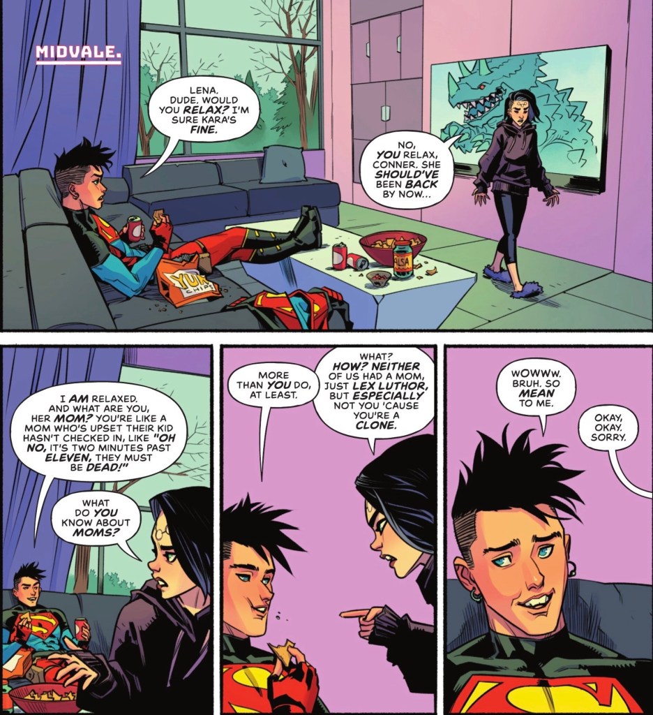Speaking of clones, in the ‘outside’ Earth Superboy Kon-El is with an agitated Lena Luthor.