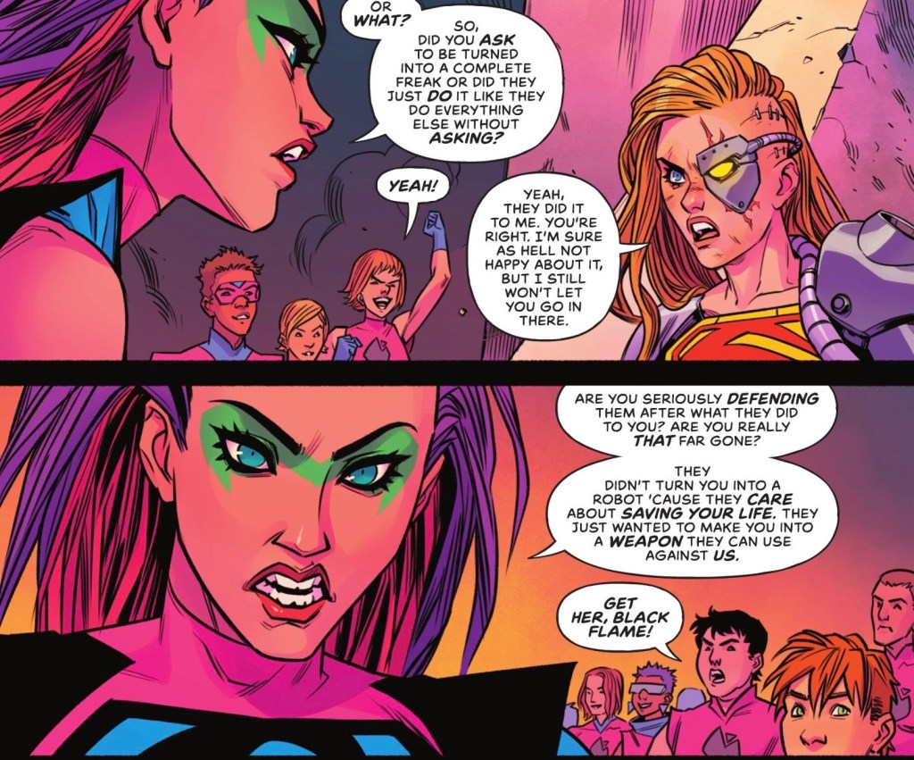 On the one hand Black Flame – aka Zora Vi-Lar – has a point, but she is rather ignoring the fact that she’s the one who eviscerated Kara, making some kind of surgery necessary.