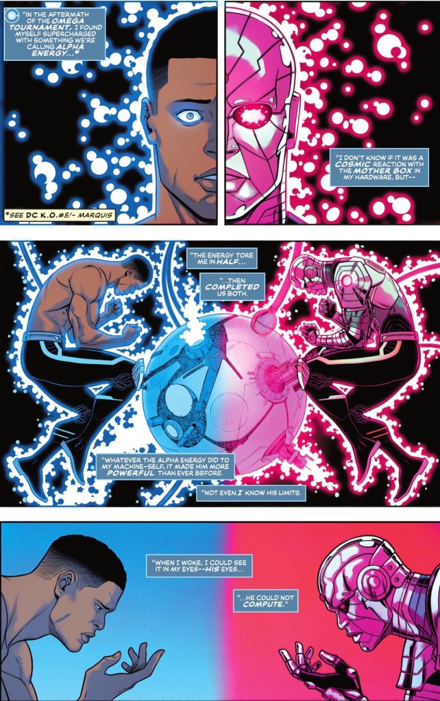 I’m pleased to see the Cyborg business in DC KO #5, a single panel of him absorbing the Heart of Apokolips thingie into his body, paid off speedily. I expected the business to be on the backburner for awhile before being addressed, if it came back at all.