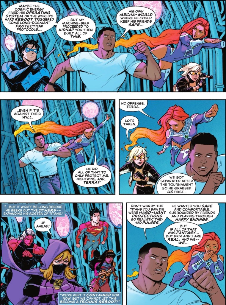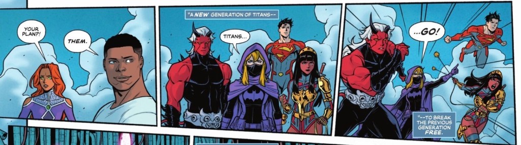This issue he finds out more as a different group of heroes calling themselves the New Titans arrive and… people start dropping dead. First it’s Donna and Speedy, then Raven and Beast Boy. Despite Nightwing’s plea they listen to what Superboy Jon Kent, Red Devil Eddie Bloomberg, Batgirl Stephanie Brown and Wonder Girl Yara Flor have to say, an understandably perturbed Starfire, Cyborg and Terra would rather attack.