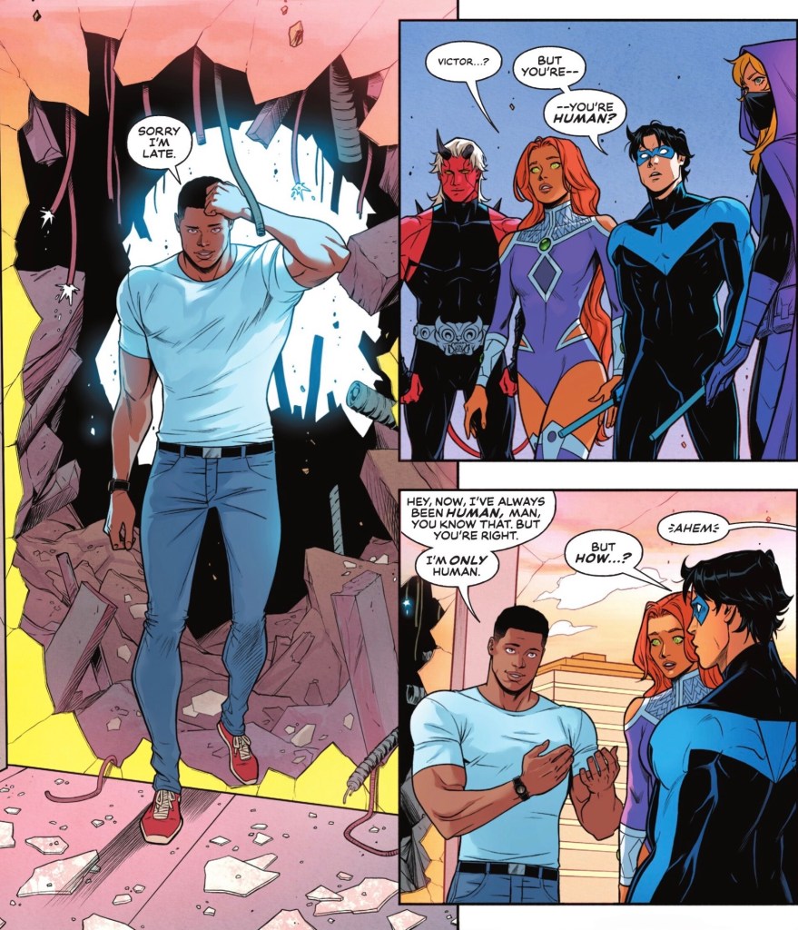 Aided by colourist Adriano Lucas, Basri does a tremendous job of varying the depiction of energy blasts, while the characters look fantastic – heck, this is the best all-flesh Vic has looked in years, and the Total Cyborg design is fantastic. Now, if only he’d give Starfire back her signature massive hair.