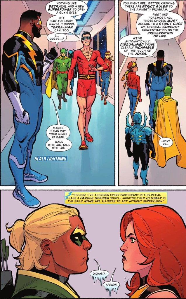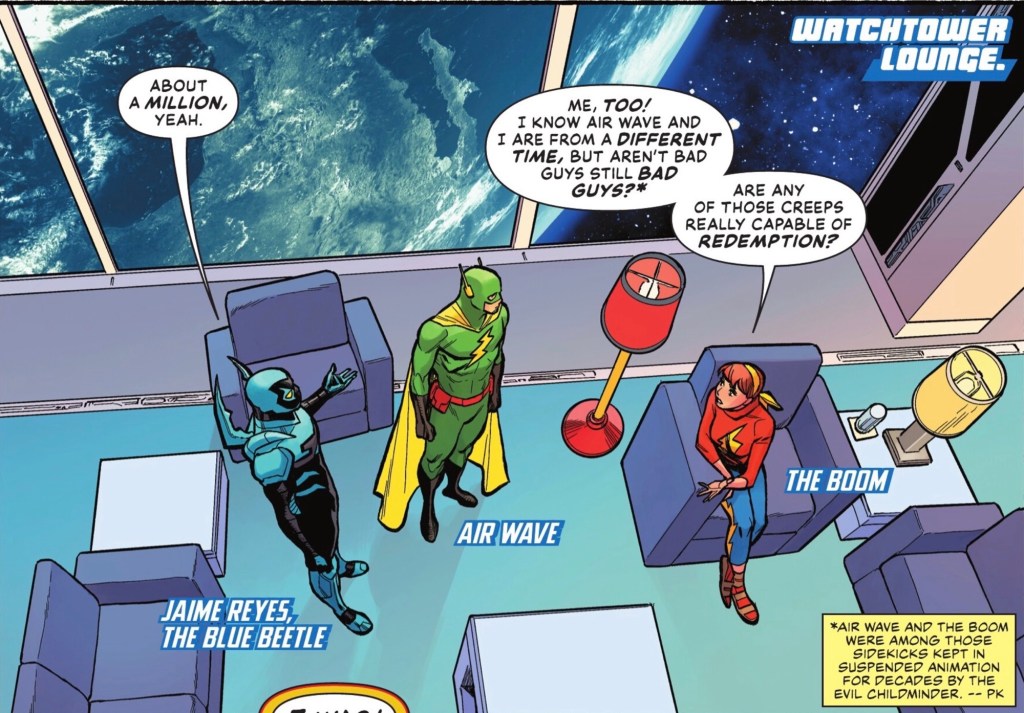 A day in the life issue, writer Mark Waid uses it as an opportunity to address the questions that would arise when a society for good opens its doors to people who have done evil things. Many evil things. Which is why it’s a case of Justice League Incredulity – everyone below the ‘senior leadership’ level – Batman, Captain Marvel, Wonder Woman, Black Lightning – has questions.