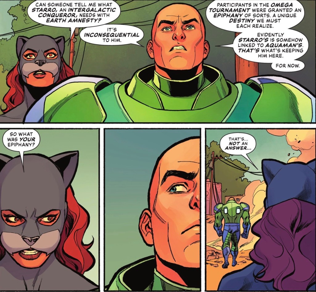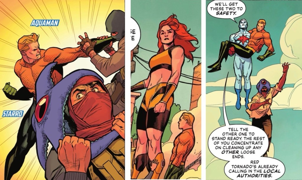 Meanwhile, Aquaman, recently upgraded to god-level, is in the depths of space in his own title, which takes place at the same time as this series. And yet here he is in Bialya, holding Starro’s interest.