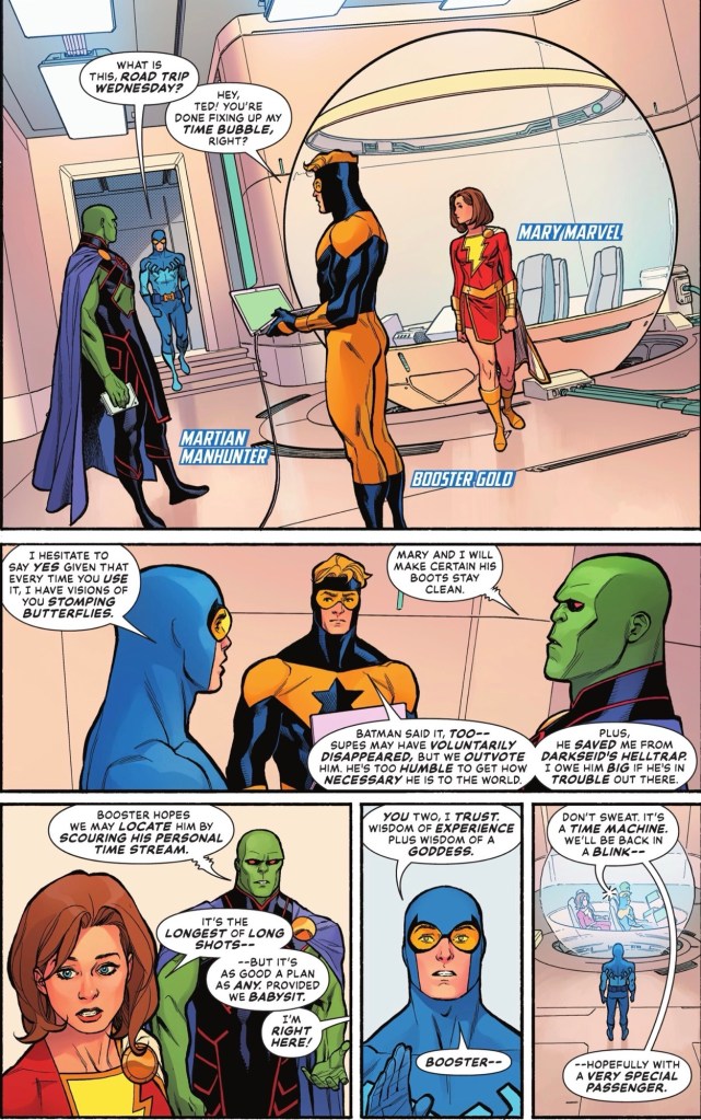 Also, I had been asking why heroes who were present when Superman said he was going off on a mission were subsequently looking for him. This issue is where we get the answer, and I rather like Booster’s justification.